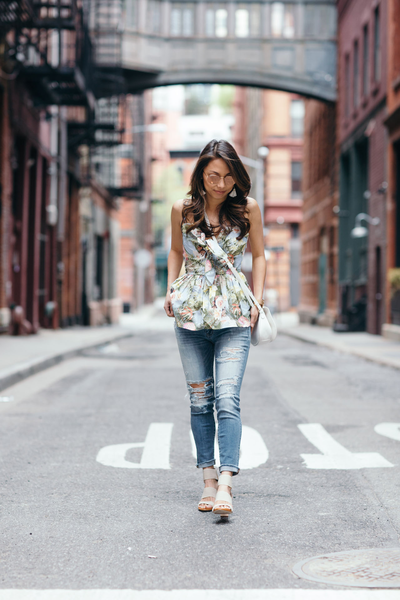 TOP: H&M Peplum Top • JEANS: AE distressed jeans • SHOES: Matt Bernson heels c/o • SUNGLASSES: Ray-Ban octagon mirrored sunglasses • BAG: Old Navy crossbody • EARRINGS: Tassel Earrings