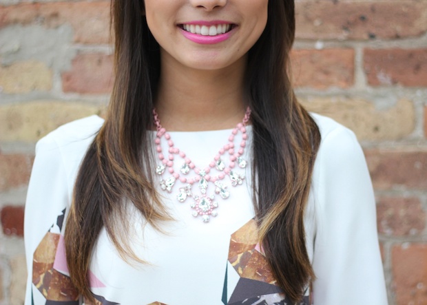 From pink lipstick to a pink chandelier necklace, I went all out this week with subtle touches of this color but offset with a white dress and nude shoes to really let the colors do the popping on their own. I think it can be easy to overdo it on too many shades of a color if it’s the main feature of your outfit, but the right accessories and beauty products can really make all of the difference in the world with balancing a look out.
