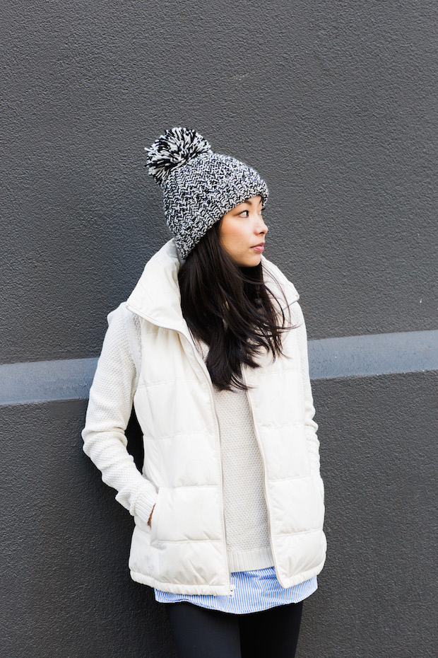 VEST: Old Navy quilted vest •  SHIRT: Talbot’s shirttail sweater c/o  •  LEGGINGS: Zara ribbed leggings (similar)  •  HAT: Old Navy pom beanie (sold out, similar here)  •  SHOES: Nike juvenate sneakers
